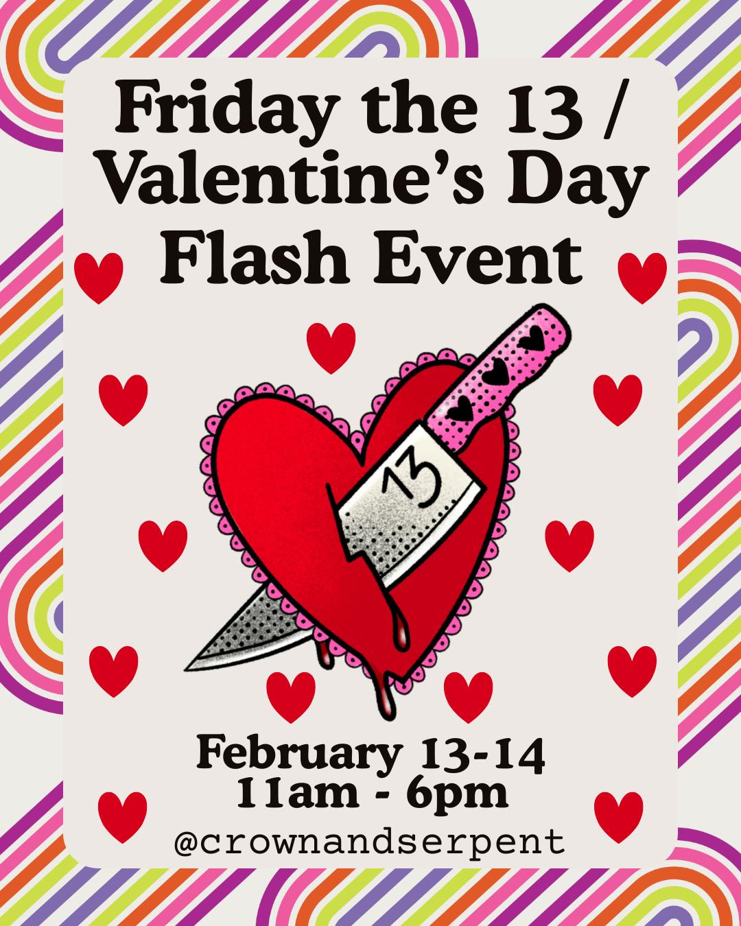 Pre-book or FCFS for our Friday the 13th and Valentine's Day Flash Event! Each artist will have their own flash sheet for you to choose designs and book directly with artists. Keep an eye on our socials for event updates! Must be 18+ to participate.