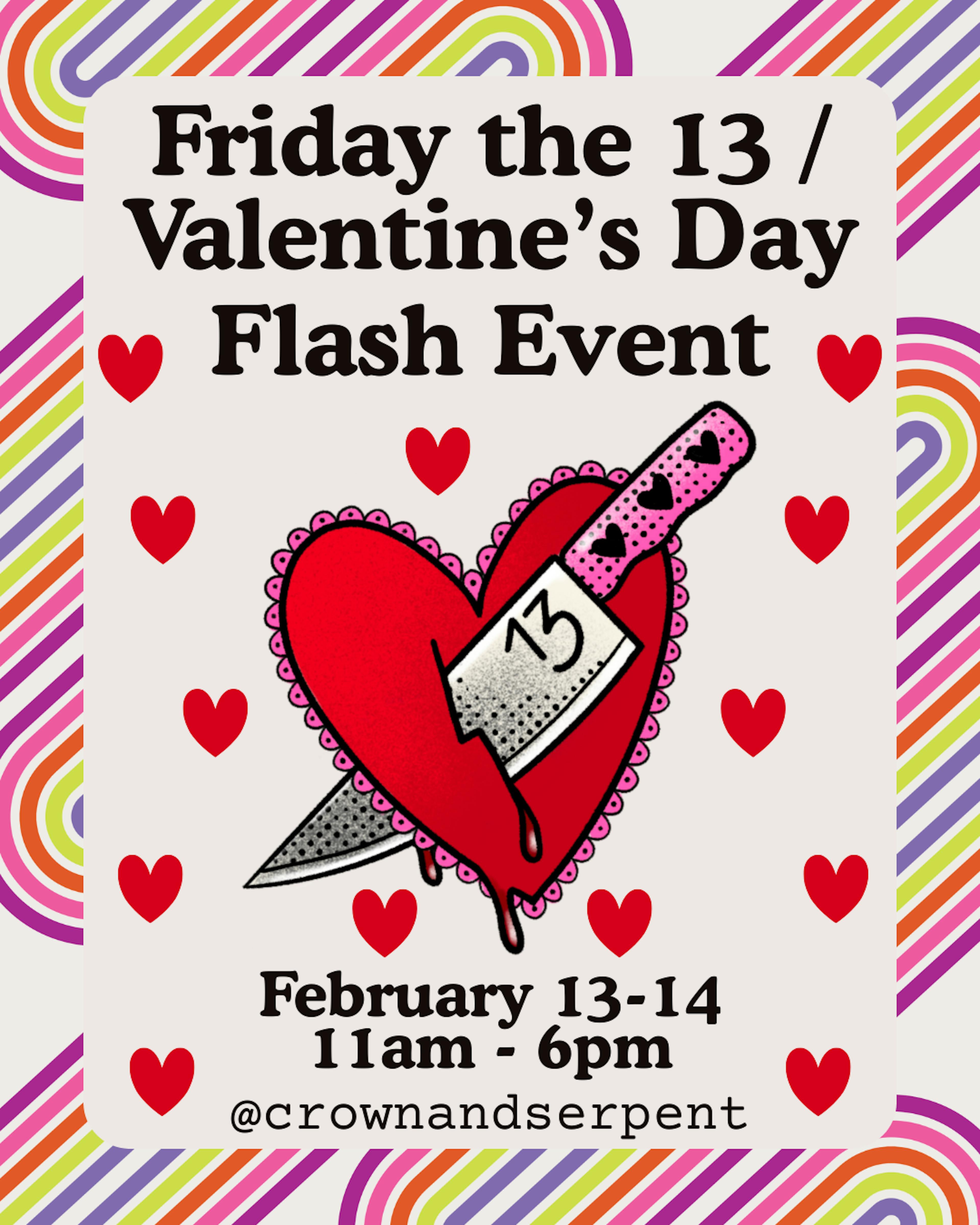Pre-book or FCFS for our Friday the 13th and Valentine's Day Flash Event! Each artist will have their own flash sheet for you to choose designs and book directly with artists. Keep an eye on our socials for event updates! Must be 18+ to participate.